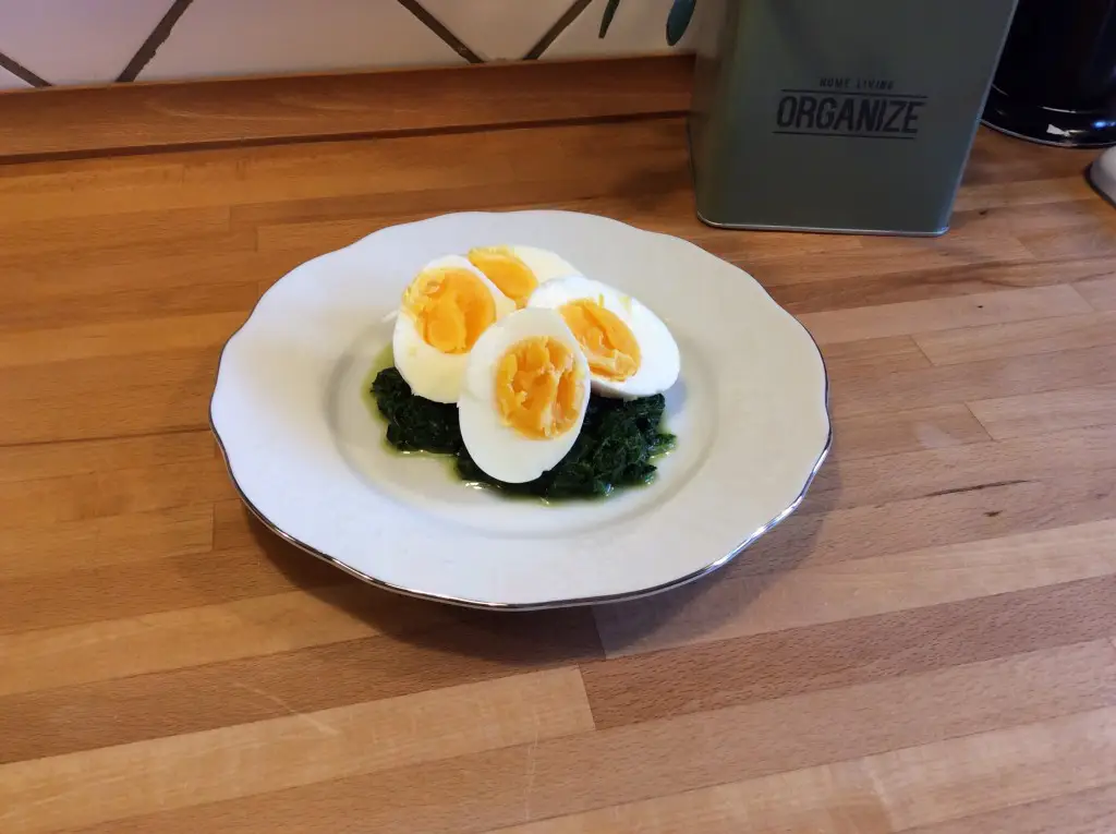 - anret de pillede æg på spinaten og hæld urtesmørret over.