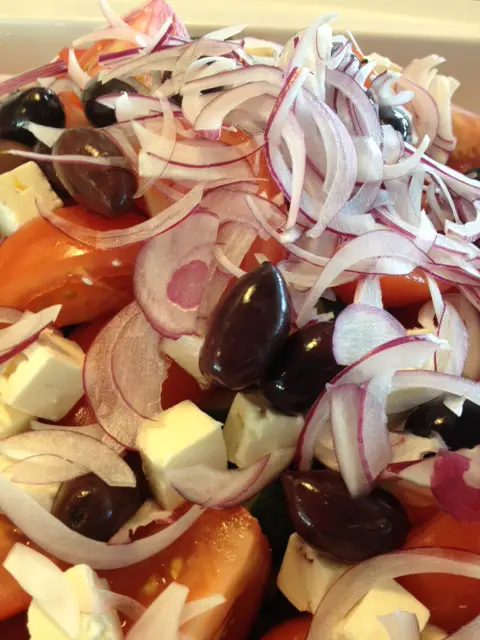 Græsk tomatsalat med feta, er en super dejlig sommer salat, den er frisk i smagen og jeg er bare vild med den. Jeg spiser den ofte når jeg rejser til Kreta. Deres solmodne tomater, grønne peberfrugter, agurk og deres flotte rødløg smager altså bare bedre end dem man kan køber her i landet. Server den til lammekød eller spis den alene. Retten alene indeholder ca. 270 kcal. pr. portion