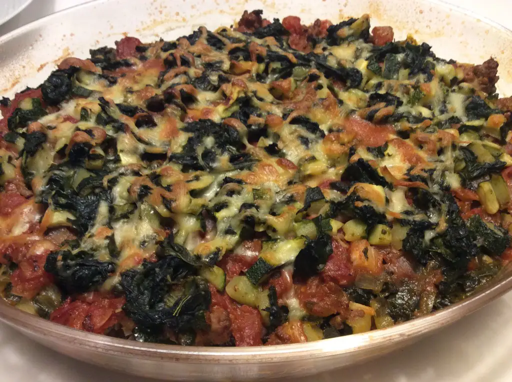 Grøn lasagne kan alle spise da den på ingen måde indeholder gluten, der er nemlig ingen lasagneplade i, men til gengæld masser af grønt og kød, now we are talking. Jeg har brugt hakkede tomater med chili, men hvis du ikke er til det lidt stærke kan du bruge almindelig hakkede tomater. Den mætter godt skulle jeg hilse og sige. Jeg har lavet en lasagne før uden plader, hvor jeg brugte squash i brede strimler, denne er lidt på samme måde bortset fra at der overvejende er brugt spinat imellem kødlagene. Kalorieindholdet i en portion Grøn lasagne er 407,5 Kcal. fordelt på 36,25 protein, 23,5 g kulhydrat og 18,25 g fedt. Server den evt. sammen med en grøn salat. Velbekomme…..
