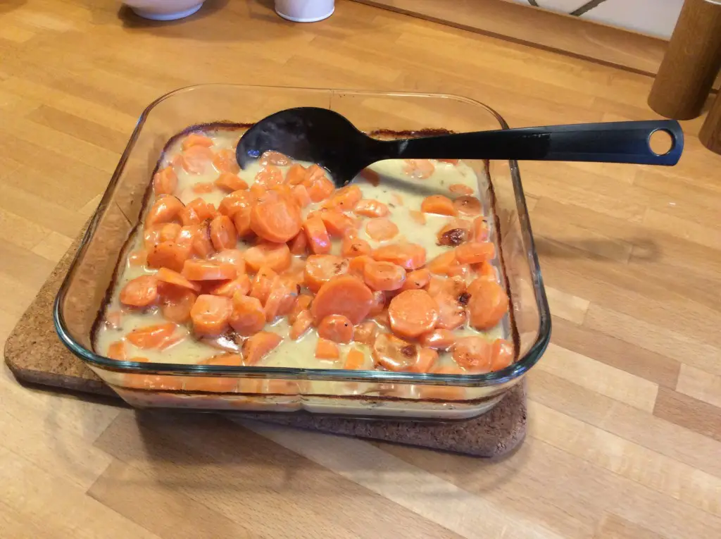 - hæld ostesaucen over gulerødderne og fordel små smørklatter på fadet