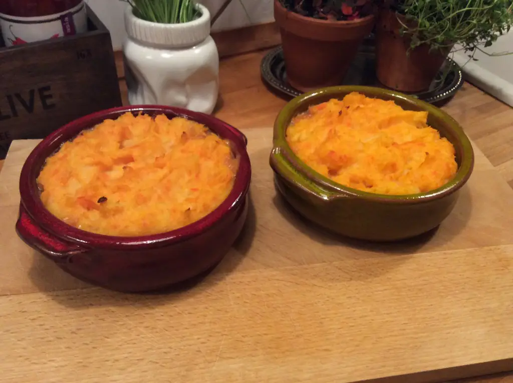 Kød i mørke er en fantastisk nem ret at lave. Smagen er meget cremet, på grund af osten, og den ligger godt i maven. Mosen er rodfrugter og smager fantastisk på denne måde, og man må godt bryde traditionerne engang imellem. Man behøver ikke altid at serverer ris eller pasta til. Farven på mosen afhænger af hvor mange gulerødder du vælger at bruge. Jeg har valgt at portions anrette min Kød i mørke, men den kan bestemt også laves i et større fad uden problemer. Velbekomme…..