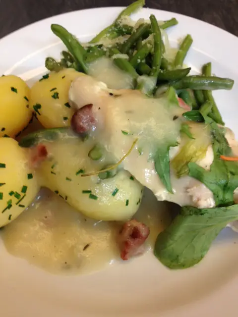 - hæld saucen over kyllingen og server sammen med de gratinerede bønner og kogte kartofler