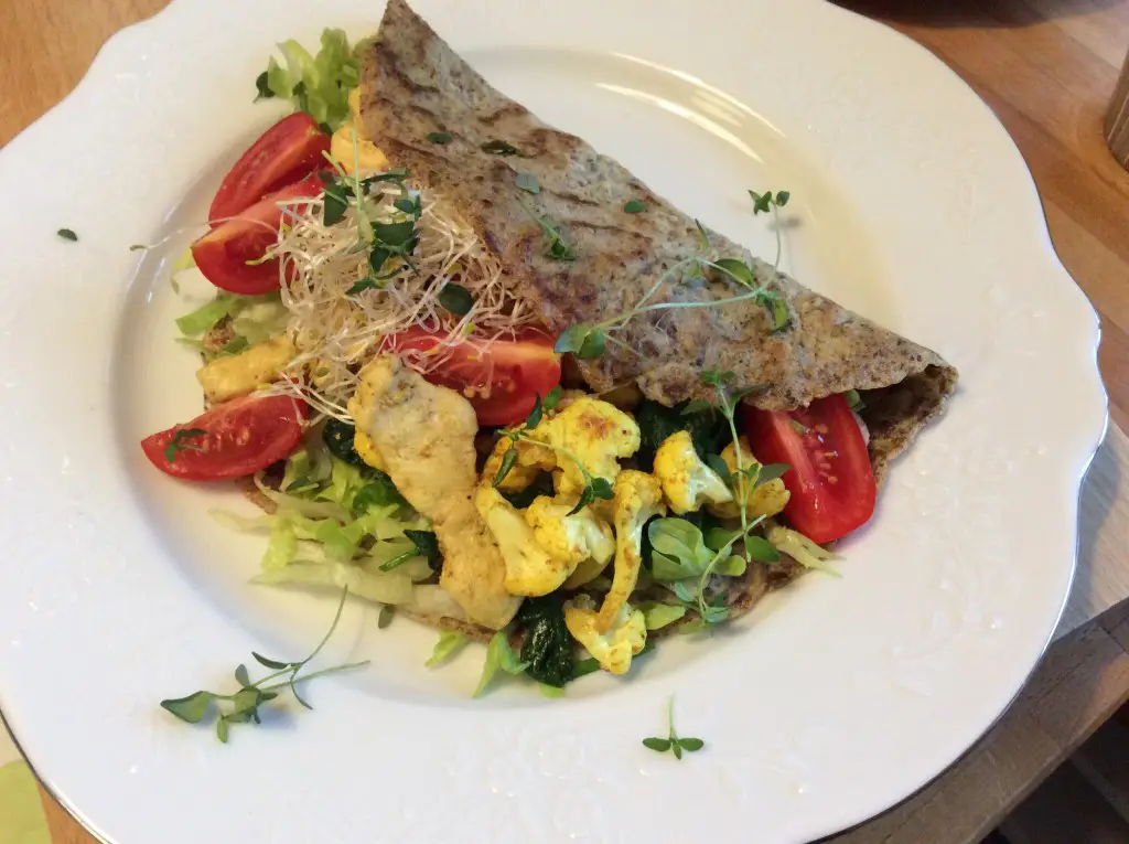 - fyld dine pandekager med den lune kylling, blandet salat, de Frække blomkål i karry og pynt af med tomater og evt. din favorit dressing