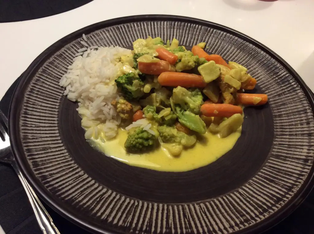 Kylling i karrygrønt er en super lækker ret til en dag hvor du ikke har så meget tid i køkkenet, men hvor det dog stadig skal være lækkert. Jeg har købt en pose karrygrønt fra Rema 1000, super nemt fra fryseren og så lige hen i køledisken og finde to kyllingebryster. Så kan det vist ikke blive nemmere, ikke noget med at slæbe flere slags grønsager hjem for derefter at rense, snitte og hakke. Ikke i dag Tak!! Sådan en pose indeholder blomkål, romanesco kål, broccoli, gulerødder og løg, samtidig med at der er tilsat krydderier. Den er jeg bestemt tilfreds med. Du kan altid tilsætte noget mere karry hvis du synes. Skal det være nemt så lad det være nemt. Grønsager fra fryseren er altså lige så godt som de friske, og så er de rensede og klargjort, lige til at bruge. Der er ovenikøbet en opskrift på posen, dog ikke den jeg har brugt i dag, men muligheden er der, hvis du skulle få lyst til at prøve. Server evt. kogte ris til retten. Kalorieindholdet i en portion Kylling i karrygrønt er 467 Kcal. fordelt på 14 g protein, 34,5 g kulhydrat, og 33,5 g fedt og 6,25 g kostfibre. Velbekomme……..