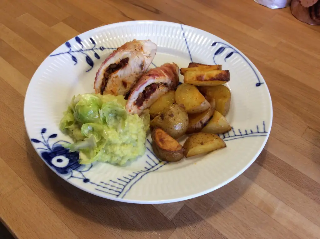 - skær en lomme i kyllingebrystet, stik en tynd kniv ind i den tykke ende og skær en lomme ind i brystet, læg hånden ovenpå brystet så du har føling med kniven. Pas på at åbningen ikke bliver for stor, da fyldet helst skal blive inde i kyllingen