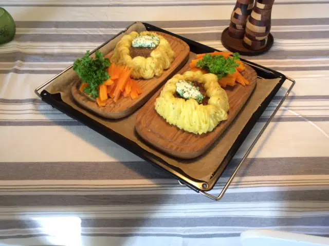 - kom mosen i en sprøjtepose med en stjernetyl og sprøjt mosen rundt om bøffen