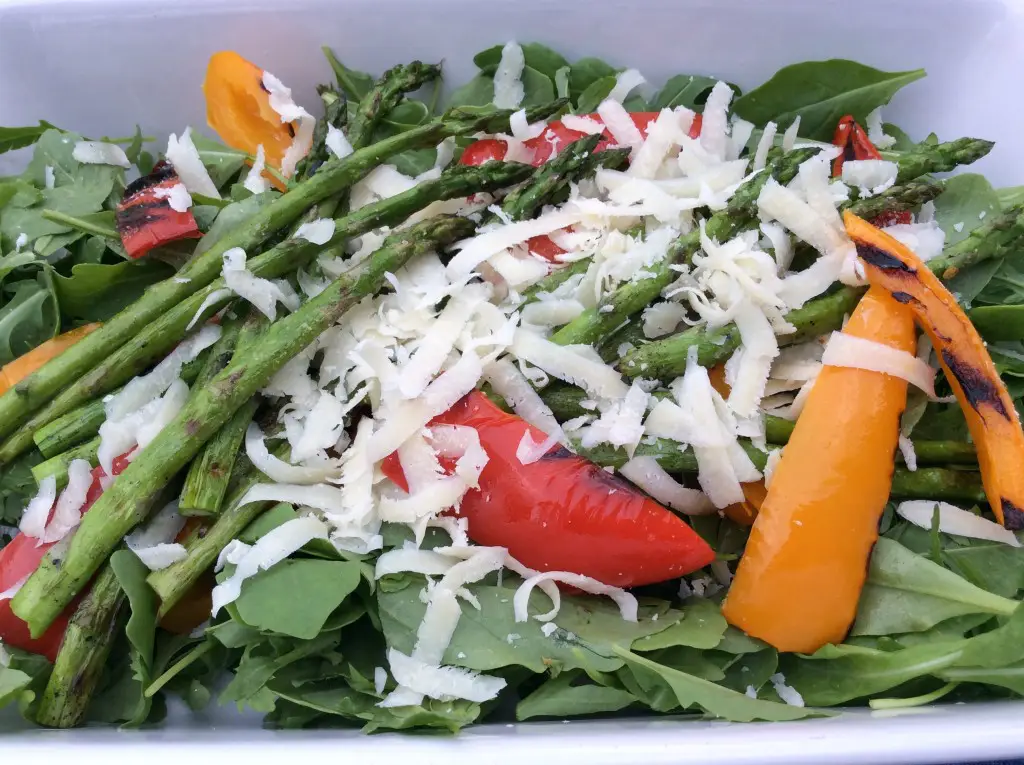 Salat med grillet asparges er en skøn og enkel salat, men fuld af smag. Grønne asparges sammen med rucola og parmesan er en fantastisk spise. Rucola er hadet af mange, men jeg synes altså at det er en skøn salat med god smag, og jeg bruger den ofte sammen med andre typer salat. Hvis du alligevel skal grille passer denne salat perfekt til et hvert stykke kød. Det er så nemt at grille sine grøntsager, og når man nu alligevel har tændt grillen kan man jo lige så godt smække grøntsagerne på. Velbekomme…….