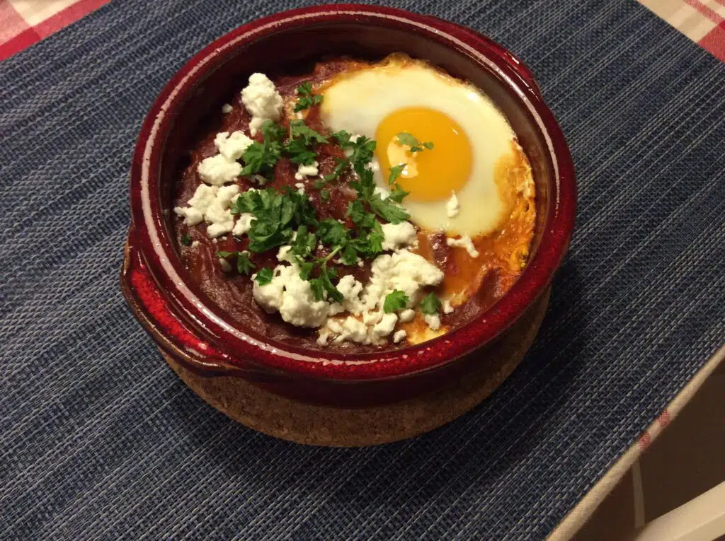 Denne vegetariske ret kan serveres både som morgenmad, til brunch eller aftensmad og er dejlig mættende og fyldt med lækker smag. Smagen af tomater, pocherede æg, grønsager og de skønne krydderier gør at retten får en dejlig varm smag der passer til alle tider på dagen.