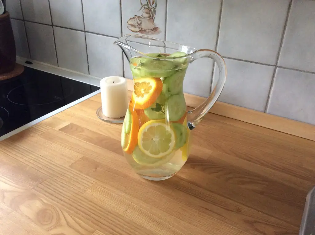 Sommerdrik med mynte smager frisk og dejligt, og det bedste ved denne skønne drik er, nul kalorier. Det er dog ikke den eneste bonus i denne Sommerdrik med mynte, den er fyldt med C-vitaminer, og så slukker den tørsten på en varm sommerdag. Citrusfrugterne skal helst være økologiske, hvis ikke skal du skære skrællen af inden du bruger dem. Denne Sommerdrik med mynte er samtidig dekorativ at have stående på morgenbordet, og det er sundt at starte dagen med frisk vand, og få skyllet alle affaldsstofferne ud, gerne jævnligt i løbet af dagen. Vand smager egentlig okay, men ind imellem er det nu rart at der kommer lidt smagsstoffer i. Prøv denne Sommerdrik med mynte en dag, du vil ikke fortryde det. God fornøjelse………