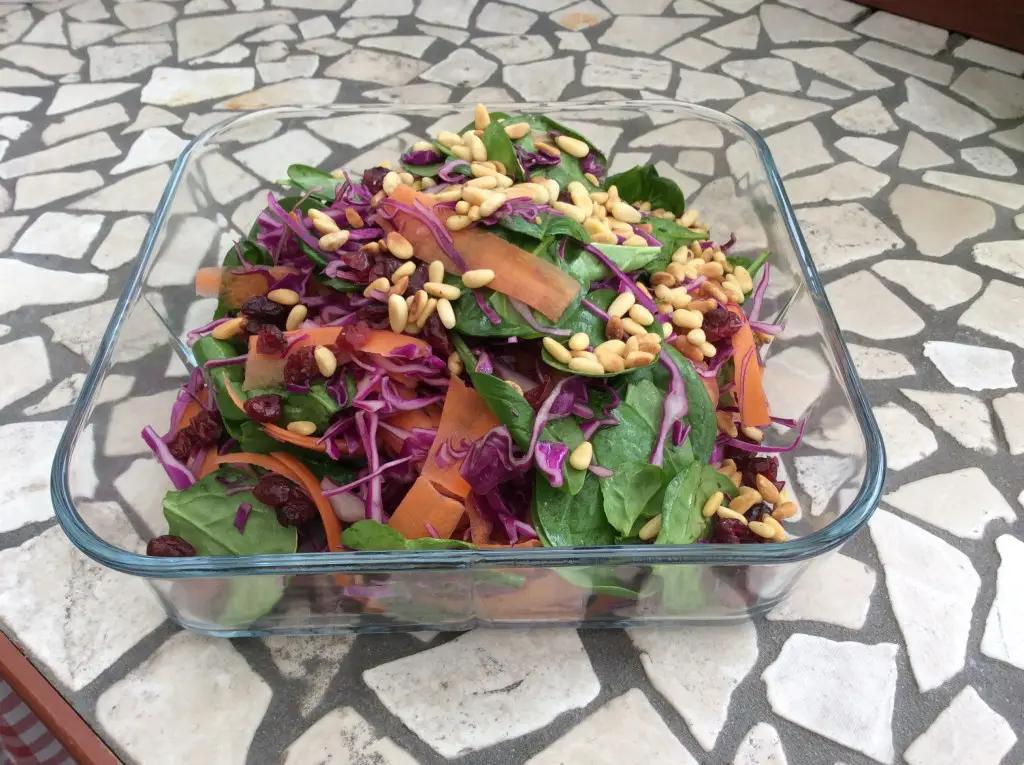 - tilsæt de øvrige ingredienser og drys til sidst med ristet afkølede pinjekerner