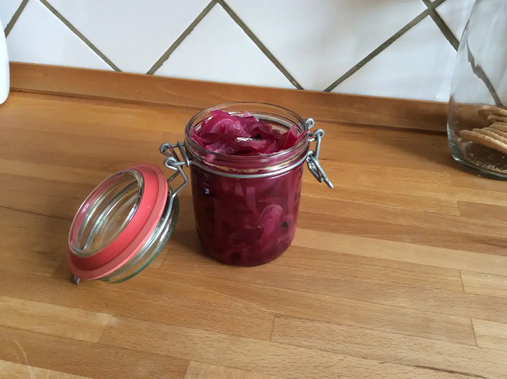 Syltede rødløg smager fantastisk og kan bruges som tilbehør til en hjemmelavet burger bl.a. Pulled pork, eller som tilbehør til ost. Du kan også bruge de Syltede rødløg i en blandet salat. Rødløg får en fantastisk flot farve, når de har fået en omgang i eddikelagen. De er stadig sprøde og knasende, selvom de har fået et lille opkog. Syltede rødløg er super nemt at lave og kan holde sig i køleskabet i ca. 2 uger. Prøv Syltede rødløg af en dag ved lejlighed.