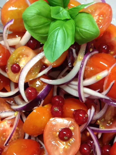 En anderledes tomatsalat med rødløg og ribs. Man kan også bruge de gule cherrytomater, så får man bare en mere farverig salat. Tomater smager skønt af sol og sommer, og findes der noget bedre end en dejlig Tomatsalat med rødløg og ribs, den er frisk i smagen og den har en god kombination mellem tomat, rødløg og ribs. Solmodne tomater i alle variationer kan bruges, gule, røde, stribede, orange, grønne eller sorte, og så giver det et fantastisk farvespil. Man siger jo at man spiser med øjnene og her er du garanteret flotte indbydende farver. Server denne salat til dit grillet kød eller fisk. Kalorieindholdet i 100 g Tomatsalat med rødløg og ribs er 33 Kcal fordelt på 0,9 g protein, 7,1 g kulhydrat og 0,6 g fedt. Velbekomme……